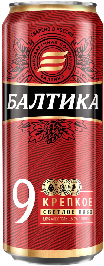 Балтика 9 - это крепкий лагер, изготовленный в России. Он имеет яркий золотистый цвет и характерный солодовый аромат. Вкус пива Балтика 9 насыщенный и гармоничный, с нотами хмеля и солода. Это пиво отличается высокой крепостью - 8%, что делает его отличным выбором для любителей более крепких напитков.